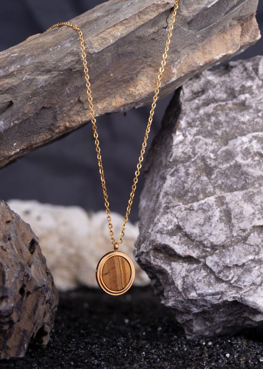 Oval Form Kaplan Gözü Doğal Taş Premium 316L Çelik Altın Kaplama Kolye